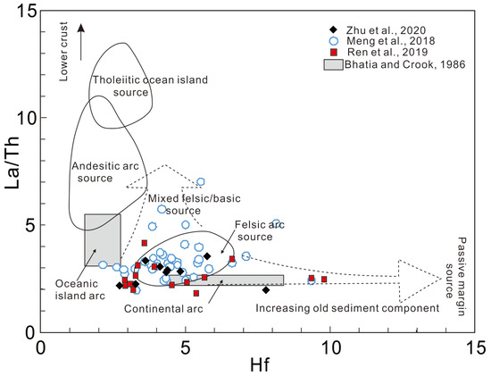 La/Th-Hf source rock discrimination diagram for the metasedimentary rocks in the Qinghe, Tonghua area (after [58]). Data sources: [33,35,46].