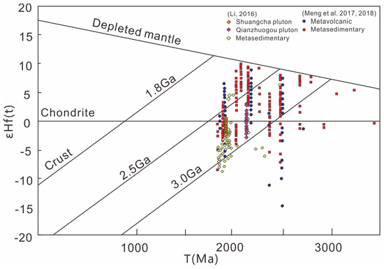 In addition, zircon Hf isotopes can effectively reflect the source properties (juvenile crust, ancient crust or depleted mantle; [61]). This paper summarizes the zircon Hf isotopes of miscellaneous metamorphic rocks and granites in the Ji’an Group. According to the εHf (t)-T diagram, the metasedimentary rocks of the Ji’an Group have εHf values between −10 and 5, which mainly originate from the recycling of an ancient crust, including Paleoproterozoic granites, coeval differentiated volcanic rocks and small amounts of Archean granites. The metavolcanic rocks of the Ji’an Group have positive εHf values of 2–7 and show low SiO2 and high contents of FeOT, MgO, CaO, Cr, Co and Ni, which were predominantly derived from the depleted mantle [33,42,43]. The gneissic granites (Qianzhuogou pluton) have εHf values of between −3 and 3, similarly to some of the metamorphic rocks. We infer that the gneissic granites are derived from both Archean TTG gneisses and the metamorphic basement of the ancient upper crust. The porphyritic granites show similar εHf values to metasedimentary rocks and are more likely to be derived from productions of the partial melting of metapelites (Figure 11). The resulting partial melting of the mantle and crust may reflect a convergent setting.