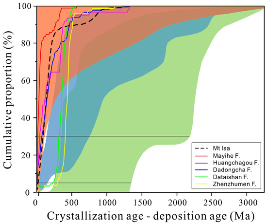 The convergent settings have a high proportion of detrital zircons (statistically generally greater than 50%) with ages close to the age of the sediment. Combined with stratigraphy, tectonics and geochemistry, high-quality detrital zircon spectra can reflect the tectonic setting [62]. Stratigraphically, the Ji’an Group can be associated with the Laoling Group. The Ji’an Group is located in the south of the Tonghua area and is mainly composed of aluminous schist, pelitic gneiss, felsic gneiss, granulite and interlayered marble and quartzite. The Laoling Group is mainly located in the north of the Tonghua area. The rock types of the Dataishan and Zhenzhumen formations in the Laoling group mainly include quartzite, felsic granulite and marble. We have compiled detrital zircon data from the metasedimentary rocks in the Ji’an Group and plotted them with depositional ages of 2140, 2120 and 2020 Ma from the Mayihe, Huangchagou and Dadongcha formations [33,34,35]. The dataset suggests that the Ji’an Group was formed in a convergent setting (CA − DA < 100 Ma at 30% of the zircon population). Furthermore, detrital zircon ages closely resemble the Mt Isa basin (Figure 12), which is a typical back-arc basin setting [63]. Detrital zircon data from the Dataishan and Zhenzhumen formations reflect an extensional setting (CA − DA > 150 Ma at 5% of the zircon population), such as a passive margin (Figure 12). Combined with the stratigraphic rock assemblage and detrital zircon, the Ji’an and Laoling Groups were deposited at the same time in different areas during the early stage and later switched to deposit in layers with each other. During the early stage, the Ji’an Group was deposited on the continental arc side, and the Laoling Group was deposited on the passive margin side. During the late stage, both groups were deposited in a back-arc basin setting [20].