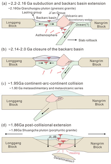 Combining these observations with the sedimentation, metamorphism and magmatism identified in the JLJB, we suggest a subduction–back-arc basin extension–collision–exhumation model for the evolution of the JLJB. The gneissic granite (Qianzhuogou pluton) and protoliths of the meta-igneous rocks (e.g., calc-alkaline basalt, andesite, dacite and rhyolite) in the Ji’an Group were formed in a subduction–back-arc basin extensional environment at ~2.2–2.16 Ga. Following this, a sequence of shales, wakes and arkoses were deposited in a continental back-arc basin at ~2.14 Ga, related to the protoliths of the metasedimentary rocks of the Ji’an Group. Later, these sediments were involved in the continent–arc–continent collision between the Longgang and Nangrim blocks at ~1.95 Ga, at which point the peak metamorphism occurred at 1.90 Ga, and isothermal decompression melting occurred during the post-collisional extension at 1.86 Ga. Meanwhile, the porphyritic granite (Shuangcha pluton) was formed in the resulting extensional environment. Finally, the post-exhumation isobaric cooling stage occurred at 1.86–1.80 Ga (Figure 13).