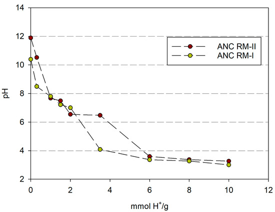 The pH, EC and ANC4.5 values assessed for RM-I and RM-II were 10.5 and 11.6, 2.08 and 2.46 mS/cm and 3.4 and 5.2 mmolH+/g, respectively. The pH was in the alkaline range for both RMs, as expected due to the chemicals involved in the Bayer process, and within the range of 9.7–12.9 reported in the literature for this kind of residues [21]. The ANC4.5 values of both RMs were between the reported range (1.4–28.4 mS/cm) [21]. The ANC curves determined with RM-I and RM-II were very similar, except for the behaviour around pH 6.5, where a higher buffering capacity was shown by RM-II (Figure 1). Since this is the typical buffering pH range of carbonates, a higher content of these compounds in RM-II was likely the cause of such behaviour. The total limestone analysis resulted in 48 g CaCO3/kg for RM-I versus 75 g CaCO3/kg for RM-II, thus confirming the hypothesis. Such difference between the samples can be attributed to the different exposure of RMs to weathering agents with RM-I being more recent than RM-II.