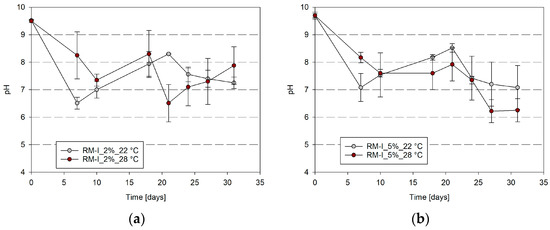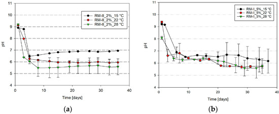 Figure 5 shows the pH trends of the tests, the errors bars indicate the standard deviation evaluated from the two duplicates. Figure 5a shows the pH trends of the three experiments at S/L 2%. In all the tests, pH values decreased very quickly and then remained stable until the end. This decrease was attributed to the biological activity since negligible pH variation was assessed in the abiotic controls, as observed also for the tests with RM-I. As shown in Figure 5a, test RM-II_2%_28 °C showed the fastest pH decrease and the lowest pH achieved (i.e., 5.4 within the first 7 days), compared with the other trials. In test RM-II_2%_22 °C the pH dropped to 6, while in test RM-II_2%_15 °C the lowest pH achieved was 6.5 (day 5) and then it remained stable around a neutral value.