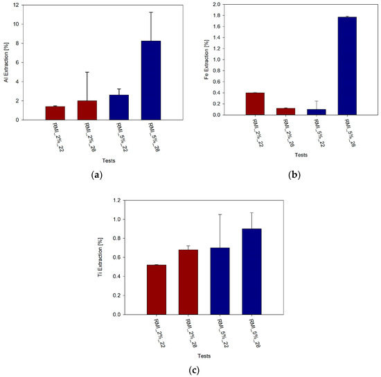 The extraction of aluminium, iron and titanium obtained during tests on RM-I is reported in Figure 3. As expected, the highest extraction of target metals was observed in test RM-I_5%_28 °C, where the lowest pH was achieved.