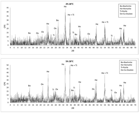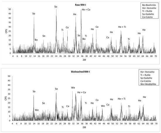 Mineralogical assessment of RM-I samples. The results of XRD analyses on RM-I before and after bioleaching (RM-I_5%_28 °C, as the best result) are shown in Figure 4. The main mineralogical components of RM-I before bioleaching were boehmite (AlO(OH)), hematite (Fe2O3), calcite (CaCO3), sodalite (KNa3Al3Cl(SiO4)3), rutile (TiO2), compatible with its chemical composition for major elements (Table 2). After treatment, the main mineralogical components were the same, except for the formation of weddellite (Ca(C2O4)-2(H2O)).