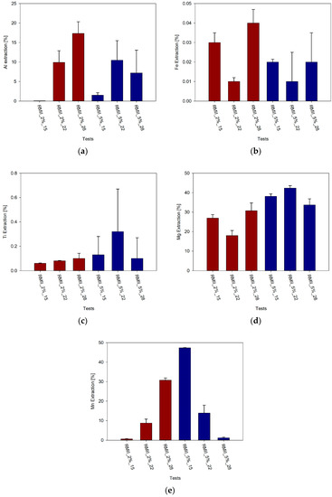 Target metals were magnesium, iron, aluminium, titanium and manganese. The maximum metal extraction efficiencies observed after two weeks of batch operation are shown in Figure 6. Aluminium showed the worst results at 15 °C for both the S/L ratios. At 2% S/L, the Al extraction increased with the temperature (maximum value of 17.3% obtained in RM-II_2%_28 °C), while at 5% S/L the highest value was obtained at room temperature (i.e., 10.5%). As for iron, although the best results were obtained for RM-II_2%_28 °C, the extraction efficiencies were always very low (<1%) due to the mineralogical phase in which iron was present in RM (i.e., hematite). Hence, the process would need a lower pH (i.e., below 3) to maximise Fe extraction. As for Titanium, a low extraction was achieved as well. A slight increase with temperature was observed at 2% S/L, even if the best results were obtained for RM-II_5%_22 °C (0.32%). The extraction of magnesium and manganese was higher than the other metals. At 2% S/L, the highest magnesium extraction was achieved at 28 °C (i.e., 30.8%); at 5% S/L, the highest Mg extraction was observed at 22 °C (i.e., 42.4%). At 5% S/L, Mn had a peculiar behaviour, since the best extraction efficiency was achieved at 15 °C (i.e., 47.4%). It should be also noticed that the concentrations of metals assessed in the liquid phase at the end of the tests were lower than those reported in Figure 6 and, consequently, the extraction of metals at the end of the batch trials was lower, showing a decrease of around 25%–30%.