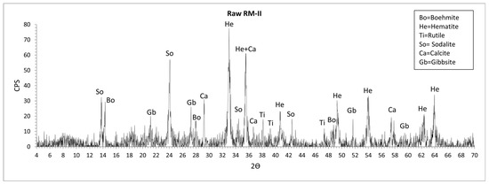 Mineralogical assessment of RM-II samples. XRD analysis showed a mineralogical composition of the raw (untreated) RM-II sample mainly consisting of hematite (Fe2O3), calcite (CaCO3), sodalite (KNa3Al3Cl(SiO4)3), boehmite (AlO(OH), gibbsite (Al(OH)3 and rutile (TiO2) (Figure 7).
