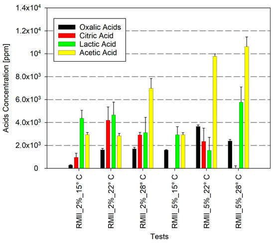 Qu et al. [8] have reported the chemical pathways from the oxalic and citric acids to their metals’ complexes. In the literature, the presence of other acids has been reported, for instance, gluconic acid [5], malic acid [10], and succinic, fumaric and tartaric acids [3]. During the heterotrophic bioleaching, the second most important part of the process, after acidolysis, is the complexolysis, i.e., the formation of complexes from microorganisms’ metabolites (ligands) and the metals cations. These complexes can affect the metals’ solubilisation, in general, increasing their solubility. The acids production obtained in the present study was compared with results obtained by Qu et al. [3] since the same LM was used, even if they performed the process under axenic conditions with an inoculum of Acetobacter. The trends of the acids production are comparable, increasing with the S/L ratios. Moreover, the acetic acid production is similar to the one observed in our study (slightly higher for RM-II_5%_22° and RM-II_5%_28°), whilst lower quantities of lactic and oxalic acids were produced [3].