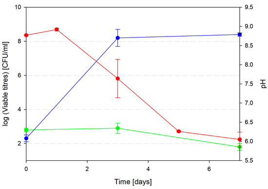 Log-transformed viable titres (mean of two replicates ± standard deviation) of heterotrophic alkaliphilic (green) and neutrophilic (blue) microorganisms as well as the pH (red) during the bioleaching test RM-II_2%_22 °C.