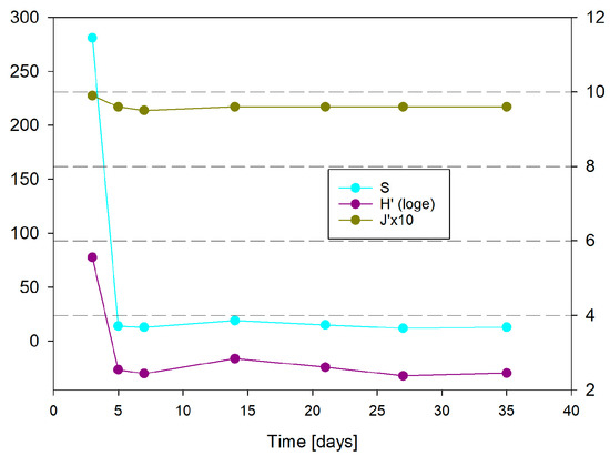 Indices of diversity and evenness of the bacterial community during the bioleaching test RM-II_2%_22 °C. Note: Richness as number of observed ASVs, H′: Shannon index with an e log base, and evenness (J′: Pielou’s).