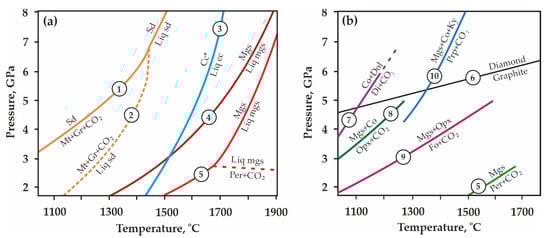 Experimentally determined pressure-temperature boundaries of melting and decomposition regarding both Mg, Ca, and Fe carbonates (a) and decarbonation reaction curves (b): 1, 2–after [31,32]; 3–after [33]; 4, 5–after [34]; 6–after [35]; 7–after [36]; 8–after [37,38,39]; 9–after [40,41]; 10–after [42]; Sd—siderite, Liq sd—liquid FeCO3, Mt—magnetite, Gr—graphite, Mgs—magnesite, Per—periclase, Liq mgs—liquid MgCO3, Cc—calcite, Liq cc—liquid CaCO3, Co—coesite, Dol—dolomite, Di—diopside, Opx—orthopyroxene, Fo—forsterite, Ky—kyanite, Prp—pyrope.