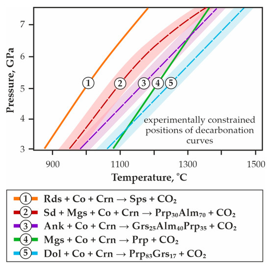 The first experimental modeling of decarbonation reactions associated with the formation of pyrope and CO2-fluid, and simulating the interaction in eclogite rocks-CO2 systems under conditions of the upper mantle, was performed in [42] (Figure 1b, reaction (11) in Supplementary Materials). Later, we carried out systematic experimental studies to determine the position of decarbonation lines in the P,T field, and established the stability regions of the CO2-fluid in association with pyrope, pyrope-almandine, pyrope-grossular, pyrope-almandine-grossular, and spessartine (Figure 1b and Figure 2, reactions (12)–(16) in Supplementary Materials) [64,65,66,67]. These experimental works were continued in studies [68,69].