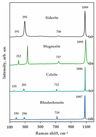 Raman spectra of initial carbonates-natural Mg-siderite (Fe0.610Mg0.357Mn0.010Ca0.024)CO3 (a), magnesite Mg0.932Ca0.060Fe0.008CO3 (b), calcite (Ca0.996Mn0.003Fe0.001)CO3 (c), and rhodochrosite (Mn0.918Fe0.011Mg0.008Ca0.063)CO3 (d).