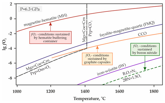 Taking into account the specifics of experiments in CO2-containing media, special attention should be paid to methodological aspects aimed at maintaining a stable fluid composition. In the experimental petrological studies, the phenomenon of hydrogen diffusion into platinum capsules at high pressures and temperatures is well known [88,89]. In this work, to prevent hydrogen diffusion into platinum capsules and a corresponding decrease of oxygen fugacity in the reaction volume, we used a high-pressure cell with an external hematite buffering container [84,90]. This technique makes it possible to maintain the ƒO2 values in a high pressure cell at the level of the magnetite/hematite (MH) buffer (Figure 4), and thus preserves the extremely low fugacity of hydrogen inside the buffering container, which ensures the minimum concentration of H2O in the fluid (no more than 0.1 mol. % [90]). The effective working time of this hematite buffering container at temperatures below 1200 °C is at least 150 h, and at 1500 °C, it is about 5 h [84].