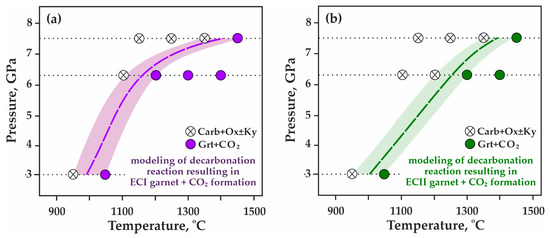 As a result of a detailed study of the obtained experimental data, the position of the decarbonation reactions leading to the formation of CO2 fluid in association with model garnets ECI (Figure 5a) and ECII (Figure 5b) was reconstructed in the P,T field. It has been found that in the (Mg,Fe,Ca,Mn)CO3-SiO2-Al2O3 system simulating ECI compositions, the decarbonation temperatures at 3.0, 6.3, and 7.5 GPa are 1000, 1150, and 1400 °C (±20 °C), respectively. In the system simulating ECII compositions, the decarbonation temperatures at 3.0, 6.3, and 7.5 GPa are 1000, 1250, and 1400 °C (±20 °C), respectively. When transposing the experimental pressures to the natural conditions, one can suppose the correspondence of 3.0 GPa to the depth of ~90 km, 6.3 GPa to 190 km, and 7.5 GPa to ~225 km. Thus, the obtained results indicate that the lower temperature limit of stability of natural garnets from carbonated eclogites in the presence of CO2 fluid is 1000 °C at depths of ~90 km, 1150–1250 °C at 190 km, and 1400 °C at depths of about 225 km.