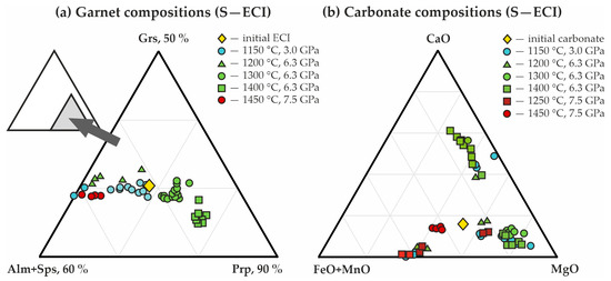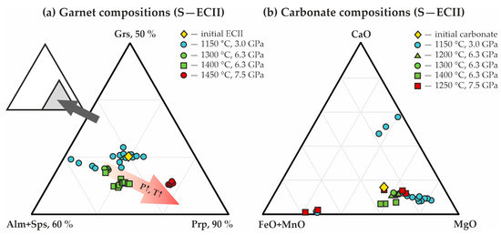 In the present study, for both ECI and ECII series, the compositions of carbonates after experiments are represented by three trends, and the largest of them corresponds to ferromagnesite (with variable CaO content). Magnesiosiderite and ferrodolomite are less pronounced (Figure 7b and Figure 10b). The compositions of garnets correspond to a single trend with constant proportions of (Alm + Sps)/Grs, and variable concentrations of the pyrope end-member (Figure 7a and Figure 10a). Moreover, an increase in the pyrope component in garnets with increasing pressure and temperature was established.