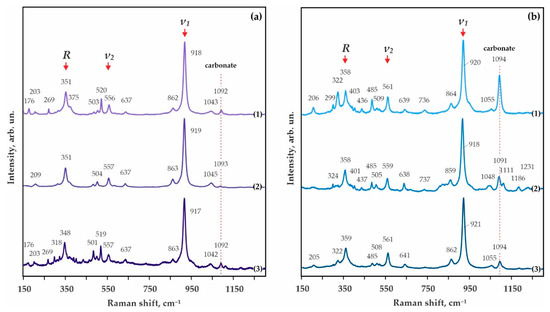 The structural features of the initial carbonates and the synthesized phases were studied using Raman spectroscopy on a Jobin Yvon LabRAM HR800 spectrometer (manufactured by Horiba, Tokyo, Japan) equipped with an Olympus BX41 stereomicroscope (manufactured by Olympus, Tokyo, Japan). The excitation source was a Torus diode-pumped solid-state laser with a wavelength of 532 nm (manufactured by Laser Quantum, Stockport, UK). The spectra were collected with a spectral resolution of 2 cm−1. Calibration was carried out using the emission lines of a neon discharge lamp at 540.06 nm and 585.25 nm. The obtained spectra were interpreted using the RRUFF database (www.rruff.info, accessed on 15 January 2023); the spectra were processed (noise elimination, baseline correction, peak identification) using the OPUS software version 5.5.