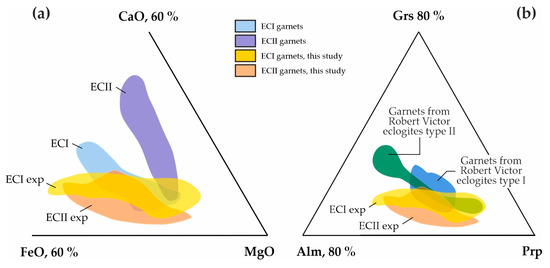 Triangle diagrams of (a) the chemical compositions of natural garnets from carbonated eclogites of type I and II [79], in comparison with synthetic garnets from this study, and (b) garnets of natural diamondiferous eclogites of Robert Victor kimberlite mine [77], in comparison with synthetic garnets from this study.