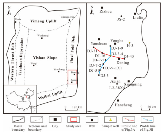 Map showing the location of the Ordos Basin and wells in the study area (modified from according to [29,30,31], revised).