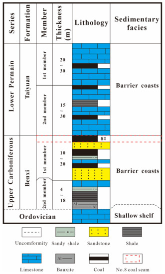 The stratigraphic column of the Upper Carboniferous Benxi Formation in the eastern margin of the Ordos Basin (according to [31], revised).