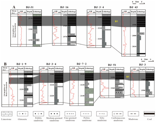 Stratigraphic profile showing distribution characteristics of the 8# coal seam. See Figure 1 for the profile locations of subfigures (A,B).