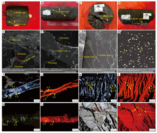 Petrographic characteristics of calcite veins in the 8# coal seam of the Benxi formation: (A) densely developed calcite veins (Well DJ-3-4, 2199.82 m); (B) structural origin high-angle fractures in coal filled with calcite (Well DJ-3-4, 2206.3 m); (C) structural origin high-angle fractures in coal filled with calcite (Well H-3, 2165.75 m); (D) densely developed calcite veins (Well H-3, 2168.56 m); (E) SEM image showing vitrinite and calcite veins, where calcite veins cross-cutting the vitrinite (Well H-3, 2168.5 m); (F) local enlargement (Figure (M), red dashed area), with calcite veins cutting through vitrinite (Well H-3, 2168.5 m); (G) SEM image showing calcite filled fractures, with the calcite vein on the left cutting through the right vein (Well H-3, 2168.5 m); (H) SEM image showing first-stage calcite developed on the surface of the vitrinite (Well DJ-3-4, 2203.2 m); (I) In XPL, C2 and C3 filled a single fracture (Well DJ-3-4, 2203.2 m); (J) Cathodoluminoscope image showing bright orange CL of the second-stage calcite and dark red CL of the third-stage calcite (Well DJ-3-4, 2203.2 m); (K) in XPL, C2 and C3 calcite filled the fractures (Well DJ-3-4, 2199.82 m); (L) Cathodoluminoscope image showing the third-stage calcite occupied a large amount of space in the fractures (Well DJ-3-4, 2199.82 m); (M) In XPL, C2 and C3 filled a single fracture (Well H-3, 2165.8 m); (N) Cathodoluminoscope image showing C2 and C3 filled fractures, where C3 replaced C2 (Well H-3, 2165.8 m); (O) In XPL, C2 and C3 filled the fractures (Well H-3, 2168.54 m); (P) Cathodoluminoscope image showing the third-stage calcite occupied a large amount of space in the fractures (Well H-3, 2168.54 m). XPL: cross-polarized light, C1: first-stage calcite; C2: second-stage calcite; C3: third-stage calcite.