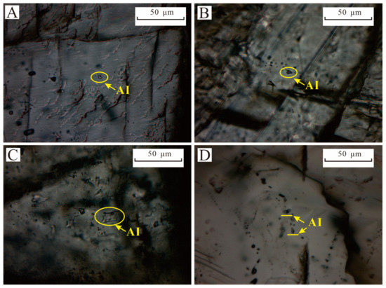 Photomicrographs showing two-phase aqueous inclusions in calcite: (A) C2, Well DJ-3-4, 2199.82 m; (B) C2, Well DJ-3-4, 2203.2 m; (C) C3, Well H-3, 2165.8 m; (D) C3, Well H-3, 2168.5 m. AI-aqueous inclusions.