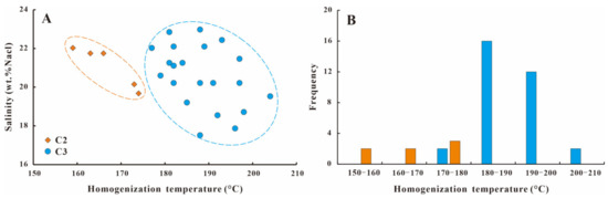 The homogenization temperatures (Th) values of the aqueous inclusions in the C2 range from 158 °C to 174 °C, with an estimated salinity of 19.68 to 22.03 wt.% NaCl equivalent. The Th values of the aqueous inclusions in C3 are higher than those of C1, varying from 177 °C to 204 °C with a similar salinity range of 17.52 to 22.98 wt.% NaCl equivalent (Figure 6).
