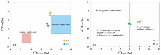 The carbon and oxygen isotope composition of authigenic calcite can reflect the source and activity of diagenetic fluids during its formation [38,39,40]. Different carbon and oxygen isotopic reservoirs in nature exhibit significant variations [41,42]. For instance, the δ13CPDB values of the igneous carbonatite range from −8‰ to −4‰ and δ18OSMOW values from 6‰ to 10‰ [42], whereas marine carbonate show δ13CPDB values varying from −4‰ to 4‰ and δ18OSMOW values from 20‰ to 30‰ [41].