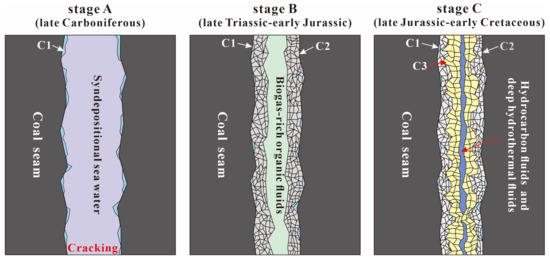 In summary, the formation process of calcite veins in the 8# coal seam can be described as follows: During the early diagenetic stage, some mud-crystal calcite (C1) precipitated in the surrounding rocks and along the fracture edges. As the burial process progressed during the Late Triassic to Early Jurassic, the organic matter of the humic type underwent anaerobic bacterial fermentation, generating a significant amount of methane gas. The reduction of organic matter provided a carbon source for fluid-rock interactions, leading to the precipitation of calcite in association with Ca-bearing fluids from the surrounding rocks. The calcite filled the fractures, forming early stage calcite veins (C2). In the Late Jurassic to Early Cretaceous, influenced by the thermal evolution of organic matter, carbon-rich fluids with distinctive isotopic signatures acted as a carbon source. Late-stage calcite filled the remaining space in the fractures, exhibiting characteristics of carbon deficit. Concurrently, deep hydrothermal fluids infiltrated the area due to tectonic activities during the Yanshanian orogeny. These fluids caused dissolution and recrystallization of the late-stage calcite and some early stage calcite, giving rise to the third-stage calcite (C3; Figure 9).