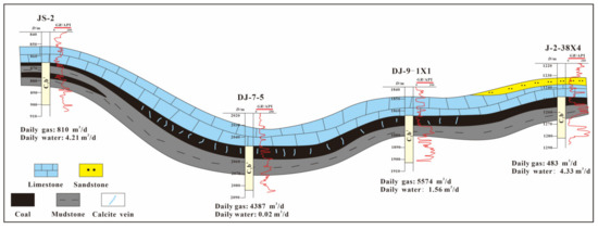 Recent exploration practices in the study area have also confirmed this understanding. The 8# coal seam in the study area is buried at a depth of around 2000 m, with daily gas production rates of 4387 m3/d for DJ-7-5 well and 5574 m3/d for DJ-9-1X1 well. In the south of the study area, the 8# coal seam in J-2-38X4 well is buried at a depth of around 1200 m, with a daily gas production rate of 4803 m3/d. However, in the north of the study area, the JS-2 well, which is buried at a depth of around 900 m, has a daily gas production rate of only 810 m3/d (Figure 10). Therefore, the development of calcite veins in the 8# coal seam in the study area is of great indicative significance for the coalbed methane enrichment zone.