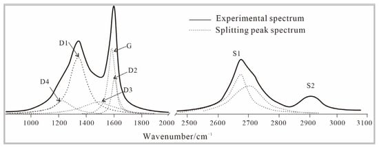 The obtained Raman spectra were analyzed using Origin 8.0 software, utilizing Lorentzian functions for fitting and processing. The Raman spectrum exhibited two bands: the first-order Raman (700 cm−1 to 2000 cm−1) and the second-order Raman (2000 cm−1 to 3000 cm−1). The first-order Raman spectrum showed four types of defect peaks, namely D1 to D4 peaks, and an ordered graphite peak G. D1 represents in-plane defects caused by the incorporation of impurities or imperfect structure, which are difficult to eliminate during graphitization. D2 represents interstitial defects in the graphite lattice [25,26]. D3 and D4 are out-of-plane defects in the carbon layers and belong to active sites, which are released and eliminated during the early stages of graphitization [27]. The second-order Raman spectrum initially showed only two peaks, S1 and S2, in the low evolution stage. As the degree of evolution increased, the S1 peak gradually split into two peaks, and the S2 peak disappeared (Figure 2).