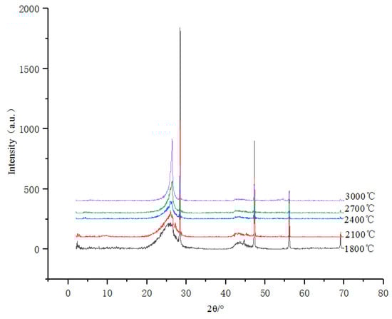 As the processing temperature increases, the carbon peak at 2θ = 26° approaches the position of the standard graphite peak at 2θ = 26.6° (Figure 4). The peak becomes sharper, and at different processing temperatures the peak shape exhibits an asymmetry, with a steeper slope on the right. The largest change in d002 occurs at the temperature intervals of initial state → 1800 °C and 2100 °C → 2400 °C. From 1800 °C to 2100 °C, d002 remains relatively stable with minimal changes (Table 2).