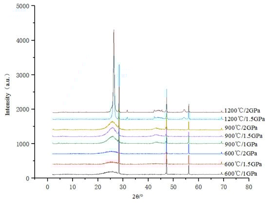 The determination of experimental temperature and pressure conditions refers to relevant domestic and international research. For example, Jiang conducted high-temperature and high-pressure experiments with the highest temperature and pressure conditions of 700 °C/0.6 GPa [22,23], and Professor Bustin’s team conducted classic high-temperature and high-pressure experiments with the highest temperature and pressure conditions of 900 °C/1 GPa [17]. In this study, the lower limit of the experimental conditions is set at 600 °C/1 GPa, and the upper limit of temperature and pressure conditions is relaxed to 1200 °C/2 GPa. Eight sets of high-temperature and high-pressure simulation experiments are conducted under the following conditions: 600 °C/1 GPa, 600 °C/1.5 GPa, 600 °C/2 GPa, 900 °C/1 GPa, 900 °C/1.5 GPa, 900 °C/2 GPa, 1200 °C/1.5 GPa, and 1200 °C/2 GPa. The experiment under the 1200 °C/1 GPa condition was not conducted due to equipment limitations at high temperature and low pressure.