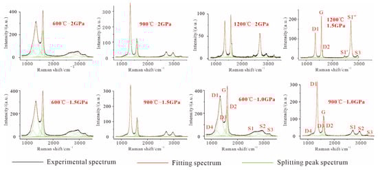 In the HTHP experiment, a clear secondary Raman peak representing the development of a three-dimensional ordered structure is observed only at temperatures above 900 °C. Under the temperature condition of 600 °C, regardless of the variation in pressure, the overall changes in the peak shape of the D and G peaks are minimal.