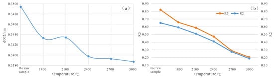 Evolution of structural parameters during the graphitization of inertinite. (a) The variation characteristics of d002 value with temperature, (b) The variation characteristics of R2 and R3 value with temperature.