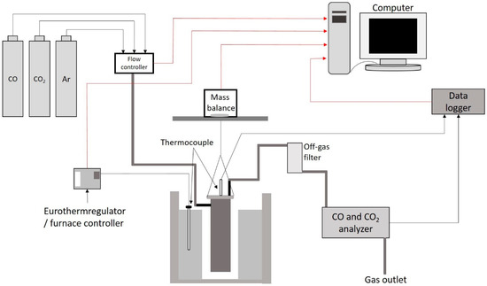 All experiments were conducted with a heating rate of 6 °C/min from room temperature to 1000 °C in a gas atmosphere consisting of 50%CO and 50% CO2 at a total flow rate of 4 L/min. At target temperature, the atmosphere was replaced by a flow of 1 L/min of argon.