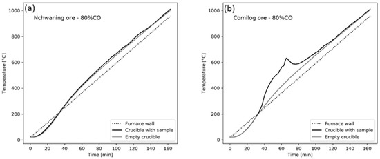 Example of temperature measurements in the furnace set up for (a) Nchwaning ore (medium oxygen ore) and (b) Comilog ore (high oxygen ore).