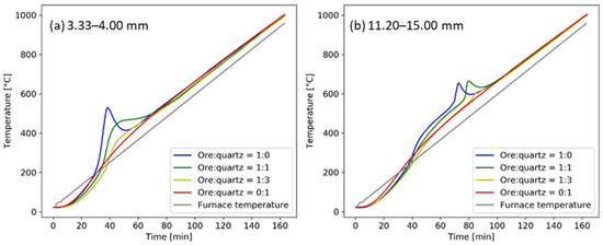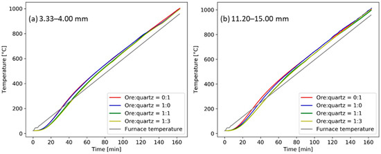 Temperature as a function of time for Nchwaning ore in size fractions of (a) 3.33–4.00 mm and (b) 11.20–15.00 mm, mixed with quartz in varying ratios.