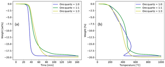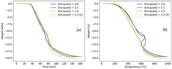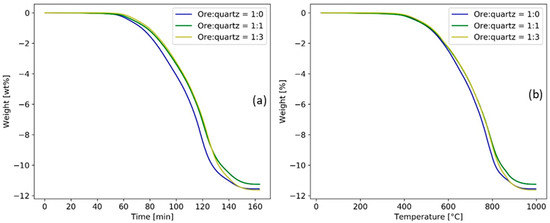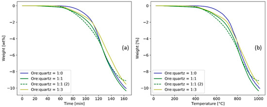 Weight as a function of (a) time and (b) temperature for Nchwaning ore in size 11.20–15.00, mixed with quartz in varying ratios.