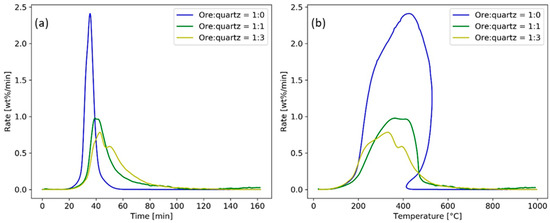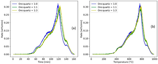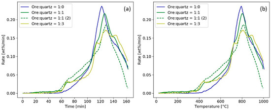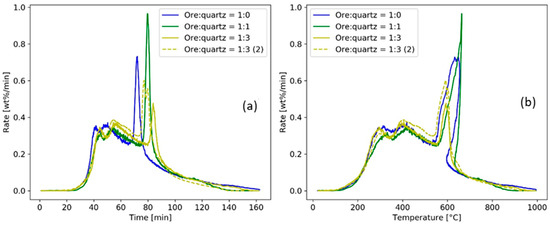 Reaction rate [wt%] calculated from the weight at 2 min intervals as a function of (a) time and (b) temperature for Comilog ore in size 11.20–15.00 mm, mixed with quartz in varying ratios.