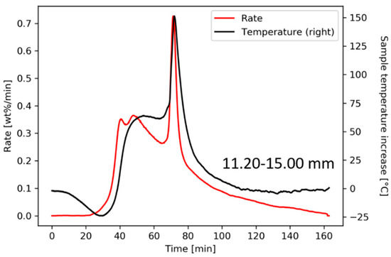 Figure 9 shows the weight reduction behavior as a function of time and temperature, respectively. Figure 10 shows the corresponding reaction rate, calculated from the change in weight at every 2 min process time interval (rolling average). It was observed that all trends observed at smaller time frames were preserved at the 2 min interval. The weight reduction behavior confirms that the samples have been exposed to highly similar temperature developments, as the weight reduction curves overlap to a large extent. A slightly higher weight loss is obtained at a given process time for the experiment conducted without quartz, according to the slightly higher temperature experienced by the sample. The same observations are made from the reaction rate behavior seen in Figure 10.