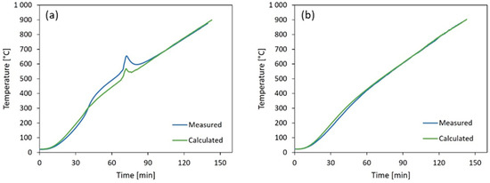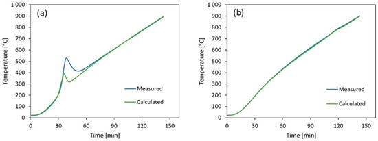 Measured temperature and temperature calculated using reaction enthalpies for (a) Comilog ore and (b) Nchwaning ore in size 11.20–15.00 mm with no quartz present.