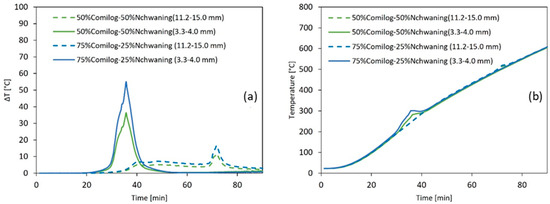 Temperature as a function of time for Comilog ore in size fractions of (a) 3.33–4.00 mm and (b) 11.20–15.00 mm, mixed with quartz in varying ratios.