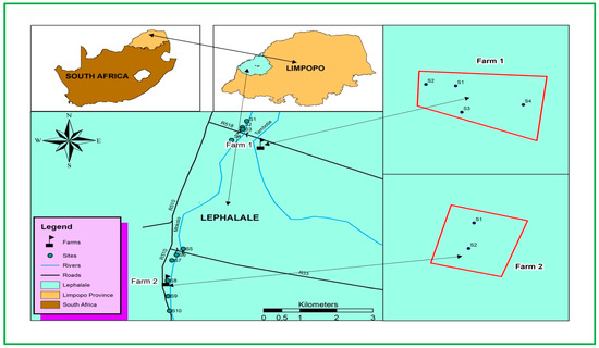 Lephalale is home to various industrial activities including Grootegeluk coal mine and Matimba and Medupi power stations which are in operation for production of electricity [20]. Coal mining and its combustion used for the production of electricity generate PTEs such as U, Pb, Mn, Cr, As and Cu, which may accumulate to toxic levels in the environment [21]. Mokolo River is a perennial river with in-house dam, which serves as a source of water for Lephalale community for domestic use. Furthermore, it is used for recreation, sand mining, fishing, irrigation of crops and drinking water for farm animals. In this study, twenty-four water samples, twenty-two vegetable samples (chomolia (C), mochina (M), onion (O), spinach (S), pumpkin (P) and thepe (T)), and ten loam soil samples were collected from Mokolo River and farms in the vicinity of the river during different seasonal flows of the river. Sample locations of soil and vegetables were formatted as F1S1, where F represents farm, the number adjacent to it refers to the farm number, and S represents the site on the farm. Water and sediment samples were collected from ten sampling sites within the river, whereas soil and vegetables were collected from two farms adjacent to Mokolo River as shown in Figure 1. All collected samples were transported to the laboratory stored in an icebox.