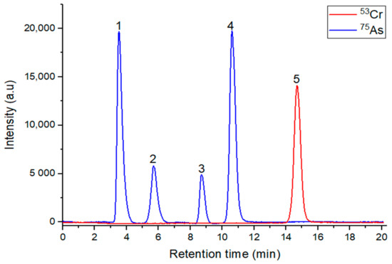 The retention time is a qualitative analysis parameter and is recorded at the apex of a chromatographic peak [37,38]. Single analyte standards were used in order to identify the retention time of each analyte and then a mixture of standards to correlate retention time with the identified species in a single analytical run. The resulting chromatogram of the individual species of As and Cr is presented in Figure 2. The detection of As and Cr species in environmental samples can be interfered with by the presence of high concentrations of Cl, resulting in polyatomic ion interferences of Ar40Cl35 on 75As and O16Cl37 on 53Cr. Polyatomic ion interferences were identified overlapping with MMA, As(V) and Cr(VI). Interference at MMA, As(V) and Cr(VI) peaks affected by Cl− content was corrected daily prior to analysis as recommended by Letsoalo et al. [39] and Low et al. [40]. The elimination of these interferences was achieved through an inter-elemental procedure using mathematical correction expressions [23]. In this procedure, a correction factor (CF) for species affected by polyatomic ion interference is determined as the ratio of the signal intensity of the interference peak at analyte mass to its signal intensity at the interference-free m/z and is formulated as follows: