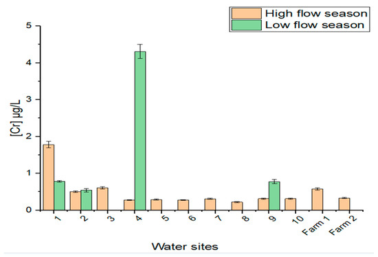 In this study, the analysis of each sample was carried out in triplicates, and the standard deviations are included as the error bars in the figures. The concentration of Cr ranged from 0.220 to 1.78 µg/L in the high-flow season, whereas in the low-flow season, the range was between 0.545 and 4.31 µg/L (as observed in Figure 3), where a majority of the site concentrations were lower than the LOD value of 0.193 µg/L. It is observed that Cr content was higher in the high-flow season than in the low-flow season, except for sites 2, 4 and 7, where Cr content is high during the low-flow season. The overall concentrations observed are lower than the MPL in drinking water set by the WHO, SANS and DWAF, which is 50 µg/L for Cr [41,42,43]. The observed concentrations were less than the MPL (100 µg/L) set for irrigation water [44]. Therefore, the water meets the standard for consumption and use in agricultural activities. The high Cr content in certain sites of the Mokolo River in the high-flow season indicates that the river experienced more contamination which could be from anthropogenic activities, sewerage water and effluents [45]. It is expected that metal content in low-flow seasons will be high (as observed with sites 2, 4 and 7) due to less dilution observed with low water levels and an increased rate of the evaporation of water bodies. However, this was not the case for most sites, as Cr is observed to dominate during the high-flow season. A contributing factor to the high metal content could be storm water run-off from river catchment surroundings contaminated with Cr [46]. Statistically, the seasonal variation was insignificant (p = 0.893) at the 95% confidence level.