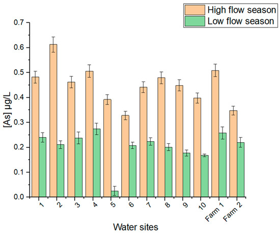 The concentration of As in water samples ranged between 0.328 and 0.612 µg/L during the high-flow season, whereas in the low-flow season, it was observed to be ranging between 0.168 and 0.274 µg/L. These results are shown in Figure 4. It is observed that high As content in water samples was detected in the high-flow season in all the water samples. Overall low concentrations were observed for As which is an indication that the bedrock is As-poor and discharge from industrial and agricultural activities is low. High concentrations of As are often observed in areas where sulfide ores associated with PTEs such as Pb, Ag and Cu are present. The associated As can be released by the effects of high evaporation rates, mineral weathering, mineral oxide desorption and the reductive dissolution of Fe oxides in reducing conditions [47]. Statistical analysis revealed that the variation in As concentration between the two seasons was significant (p = 2.13 × 10−8). This variation may be associated with slightly low industrial and agricultural discharge observed during the low-flow season [47].