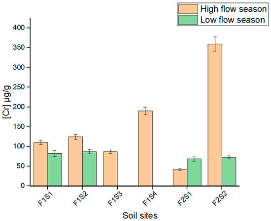 The presence of Cr was detected in soil samples obtained from farms 1 and 2 during both sampling seasons, and the results are displayed in Figure 5. The levels of Cr in farm 1 ranged from 86.7 to 125 µg/g and 82.6 to 87.0 µg/g in the high- and low-flow seasons, respectively. In farm 2, it ranged from 41.8 to 360 µg/g and 68.5 to 72.5 µg/g, respectively. It was observed that with most farm sites, the high-flow season had higher Cr content than the low-flow season except for F2S1. In the low-flow season, samples of soil in F1S3 and F1S4 were not collected; hence, no Cr content was reported as the sites did not have any vegetables growing during that season. The observed Cr content in most sites exceeded the Canadian soil quality guideline value of 64.0 µg/g. Exceeding the guideline value can result in discolored leaves, chlorosis, ailing root systems and stunted growth in vegetables grown in the soil, affecting food security negatively [48]. Only F2S1 Cr content was lower than the soil quality guideline value. The introduction of Cr into the soil may be through the use of fertilizers (confirmed by residents of the farm), atmospheric deposits introduced through the burning of coal by power stations in proximity and irrigation water [21,49,50]. The contribution of Cr by irrigation water was likely to be very low as it was observed during analysis that the concentrations were extremely low in the high-flow season and not detected in the low-flow season. Seasonally, statistical variation in Cr was insignificant (p = 0.0670).