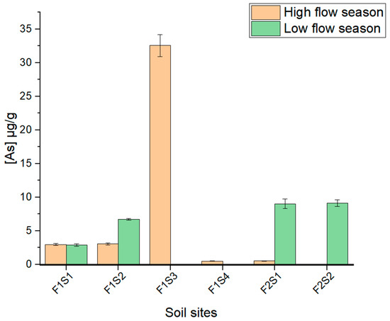 The As concentrations in soil ranged from 0.50 to 32.6 µg/g and 2.89 to 6.74 µg/g in farm 1 in the high- and low-flow seasons, respectively. In farm 2, 0.0453 to 0.520 µg/g and 9.03 to 9.14 µg/g As concentrations were observed, as shown in Figure 6. The As content observed in each site differed and decreased from the high-flow season to the low-flow season. Similar observations have been observed in a study by Lombard et al. [51], and this was attributed to an inverse relationship observed between the amount of precipitation linked to a season and total As levels. This is due to the lowering of the water level in seasons of less precipitation and processes such as the dissolution and oxidation of sulfide and oxide-bearing minerals containing As [51]. The statistical variation in As in both seasons was statistically insignificant (p = 0.726). The total As content in soil samples was less than 48 µg/g, which is the soil screening value [28], and also less than the soil quality guideline value of 12 µg/g [52], with the exception of F1S3, which was greater than 12 µg/g. The observed concentrations were well within the recommended guidelines as phytotoxic effects (reduction in various vegetable yields) have been observed where the As content in soil is only greater than 10 µg/g [52].