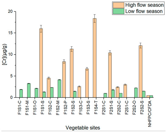 The analysis of each vegetable sample was carried out in triplicates, and the standard deviations are included as the error bars in the figures. Some vegetables were not present for both sampling seasons. This is due to local farming practices and the availability of vegetables in different seasons. For instance, chomolia germinates and grows in temperatures of 7–18 °C and is referred to as a cool-season vegetable [60]. In high- and low-flow seasons, the Cr concentration ranged from 2.58 to 18.4 µg/g and 1.02 to 4.15 µg/g, respectively. During the high-flow season, it was observed that thepe (farm 1) and spinach (farm 2) accumulated more Cr, whereas, in the low-flow season, the highest accumulators of Cr were the mochina and onions. It can be observed through vegetables in both sampling seasons that less Cr content was detected in the low-flow season than in the high-flow season, as shown in Figure 7. Statistical analysis revealed a significant variation for Cr seasonally as p < 0.05 at a 95% confidence level. The MPLs of Cr in vegetables have not been established in South Africa [61]. However, this level has been set by NHFPC/CFDA as 0.5 µg/g [62]. All the vegetables collected during both the high- and low-flow seasons surpassed the MPL, which makes these vegetables unsafe for consumption. Total Cr concentrations in vegetables were reported from Lepelle, Botshabelo and Diphuti (Limpopo Province, South Africa) and revealed that the average Cr content was 1.43 µg/g [13]. The reported average value in that study was below the average values of 8.71 and 2.02 µg/g from this study in the high- and low-flow seasons, respectively.